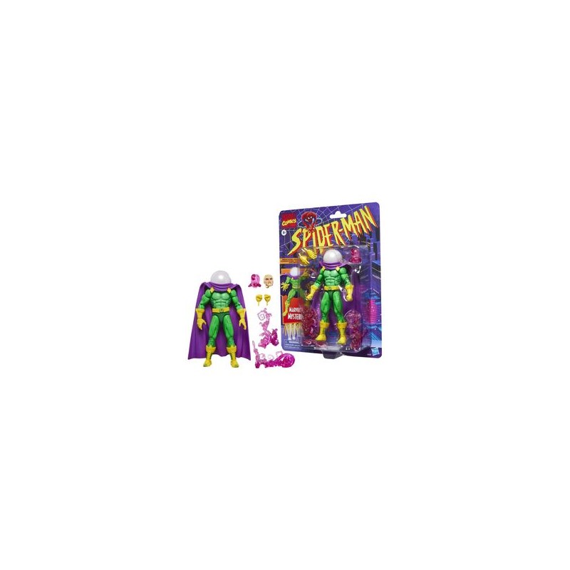 Hasbro presenta, dentro de la colección Marvel Legends Series, esta figura articulada de Mysterio inspirada en su apariencia en la serie "Spider-Man: The Animated Series". Mide aproximadamente 15 cm. y sus articulaciones permiten recrear poses dinámicas para su exhibición. Cuenta con un diseño premium, fiel a su aspecto en la serie de animación. Incluye 1x cabeza alternativa sin casco con el rostro de Quentin Beck, 2x manos adicionales y 3x piezas de efectos visuales (2 espirales de humo y 1 de calavera). Se presenta en un blíster estilo retro con ilustraciones.