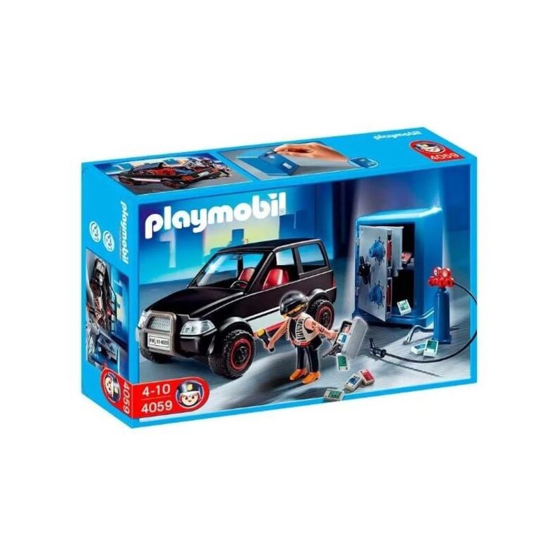 Completa tu ciudad Playmobil con este Ladrón de Caja Fuerte con Coche. Este playset es combinable con la comisaría de policía y demás sets de Playmobil con figuras de policía. En el interior de la caja encontrarás 1 figura de ladrón, 1 coche, 1 caja fuerte, 1 pistola y varios accesorios más. Además, la caja fuerte te servirá como hucha para guardar tus ahorros. Playmobil. Ref.: 4059. Edad recomendada: +4 años.
