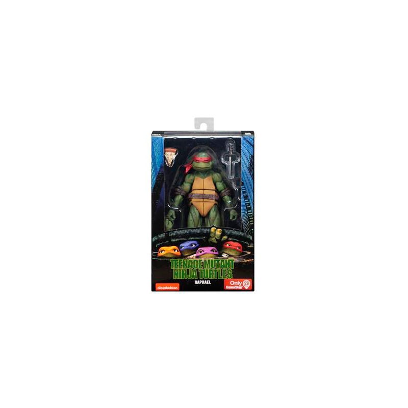 Neca presenta estas figuras articuladas inspiradas en la película de 1990 de "Teenage Mutant Ninja Turtles". Cuatro reptiles que se transformaron en el cuarteto contra el crimen en Nueva York, después de atravesar un charco de desechos radioactivos. Hechas en PVC, miden unos 18 cm y vienen cada uno con un arma y otros accesorios, incluyendo (por supuesto) una porción de pizza. En este caso se trata del personaje Raphael, el que peor genio tiene del grupo.